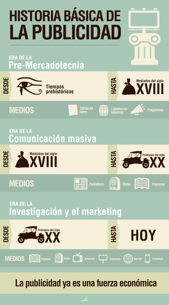 Los primeros agentes publicitarios surgieron en el siglo XVIII y se dedicaban a vender publicidad para los periódicos, quienes les pagaban comisión por cada espacio vendido. Estos pioneros de la industria pronto se dieron cuenta de que era más fácil concretar la venta si mostraban al anunciante cómo se vería el espacio, ahí comenzaron a ofrecer diseño y textos por lo que comenzaron a contratar personas dedicada a esas funciones.